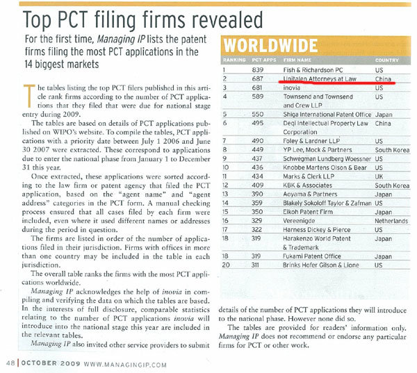 根據全球權威知識產權刊物Managing Intellectual Property (MIP)2009年10月期公布的一份數據顯示,全球PCT申請統計中,在申請日(優先權日)介于2006年7月1日至2007年6月30日之間,30個月的絕限落在2009年1月至2009年12月間的已經公開的PCT申請中,集佳知識產權代理有限公司以687件申請在全球代理機構排名中僅次于一家美國事務所而位列第二,也是中國唯一一家躋身全球前五名的知識產權服務機構。