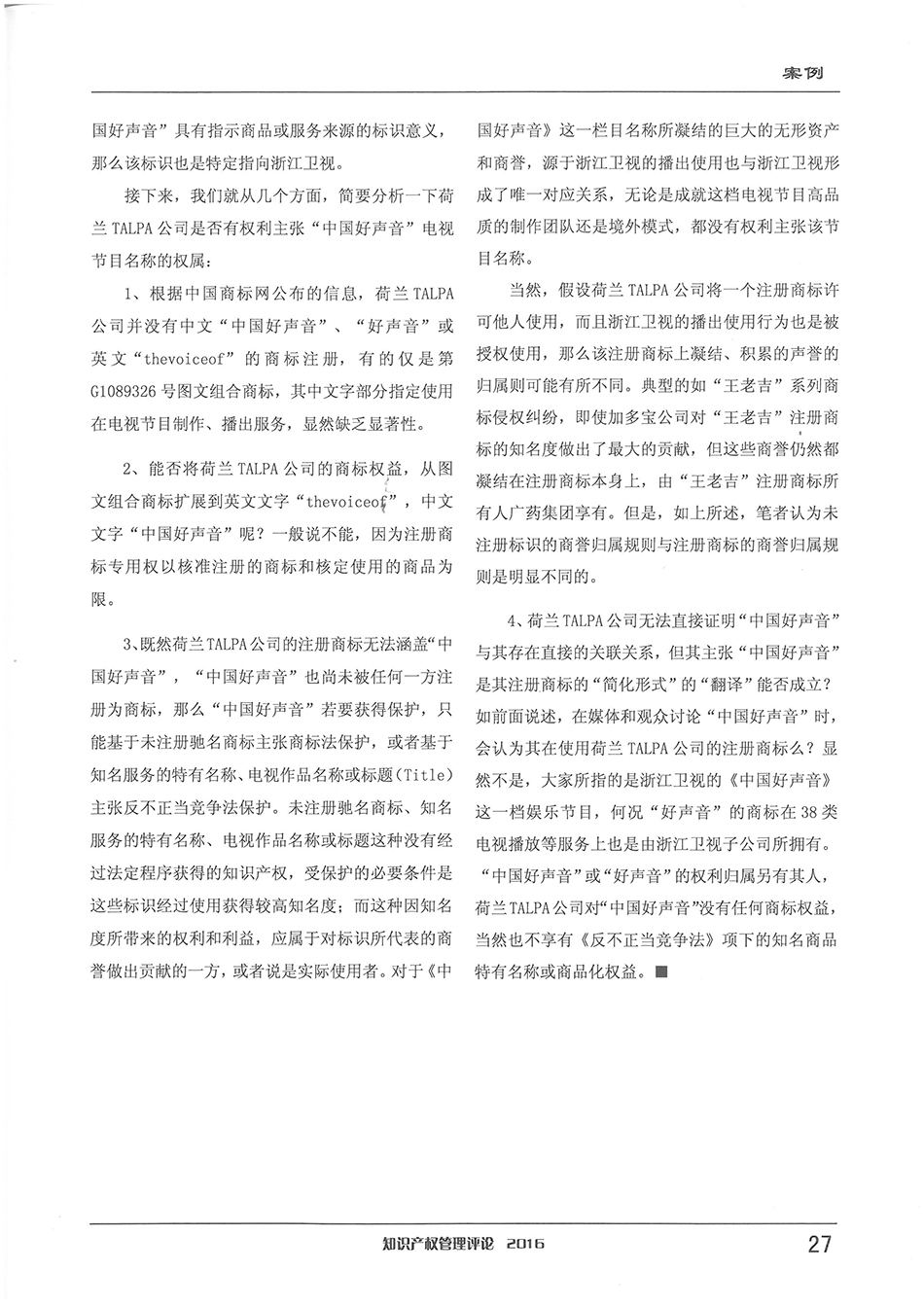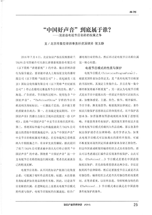 集佳資深律師侯玉靜文章《“中國好聲音”到底屬于誰?——淺談該電視節(jié)目名稱的權(quán)屬之爭》在《知識產(chǎn)權(quán)管理評論》發(fā)表
