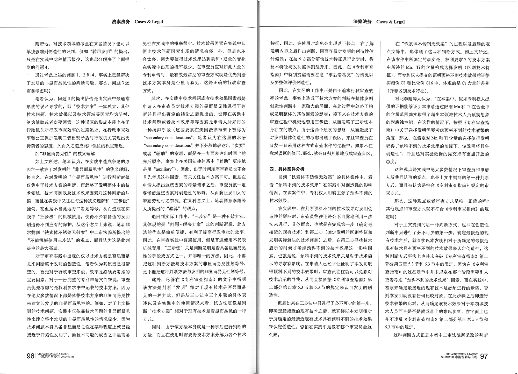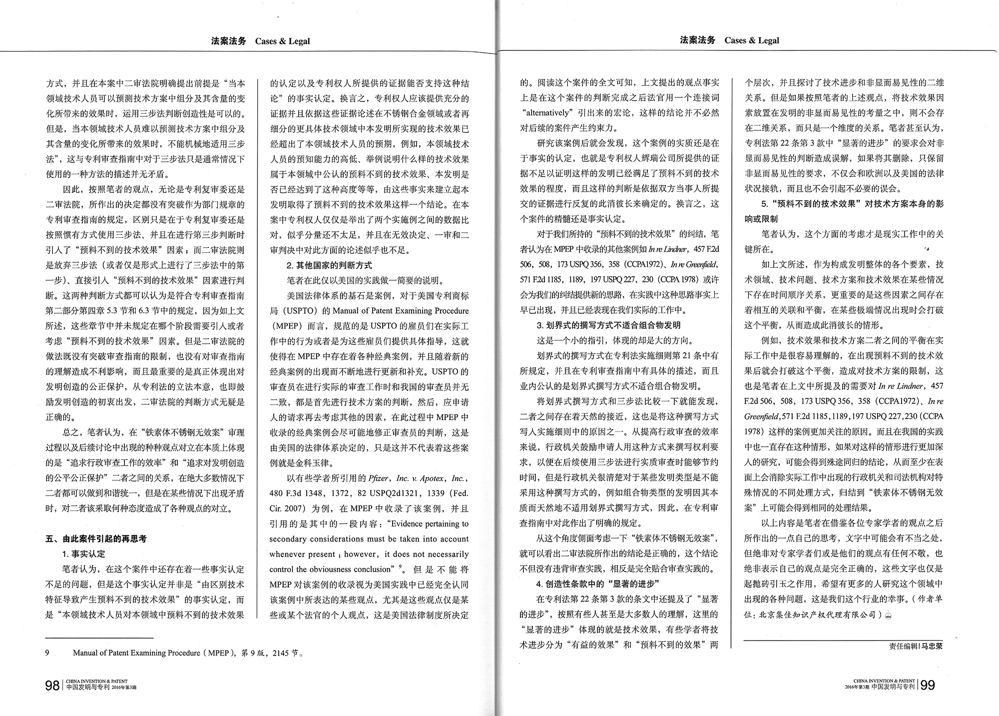集佳代理人文章《“預料不到的技術效果”對創造性判斷的影響--也說鐵素體不銹鋼無效案》在《中國發明與專利》發表
