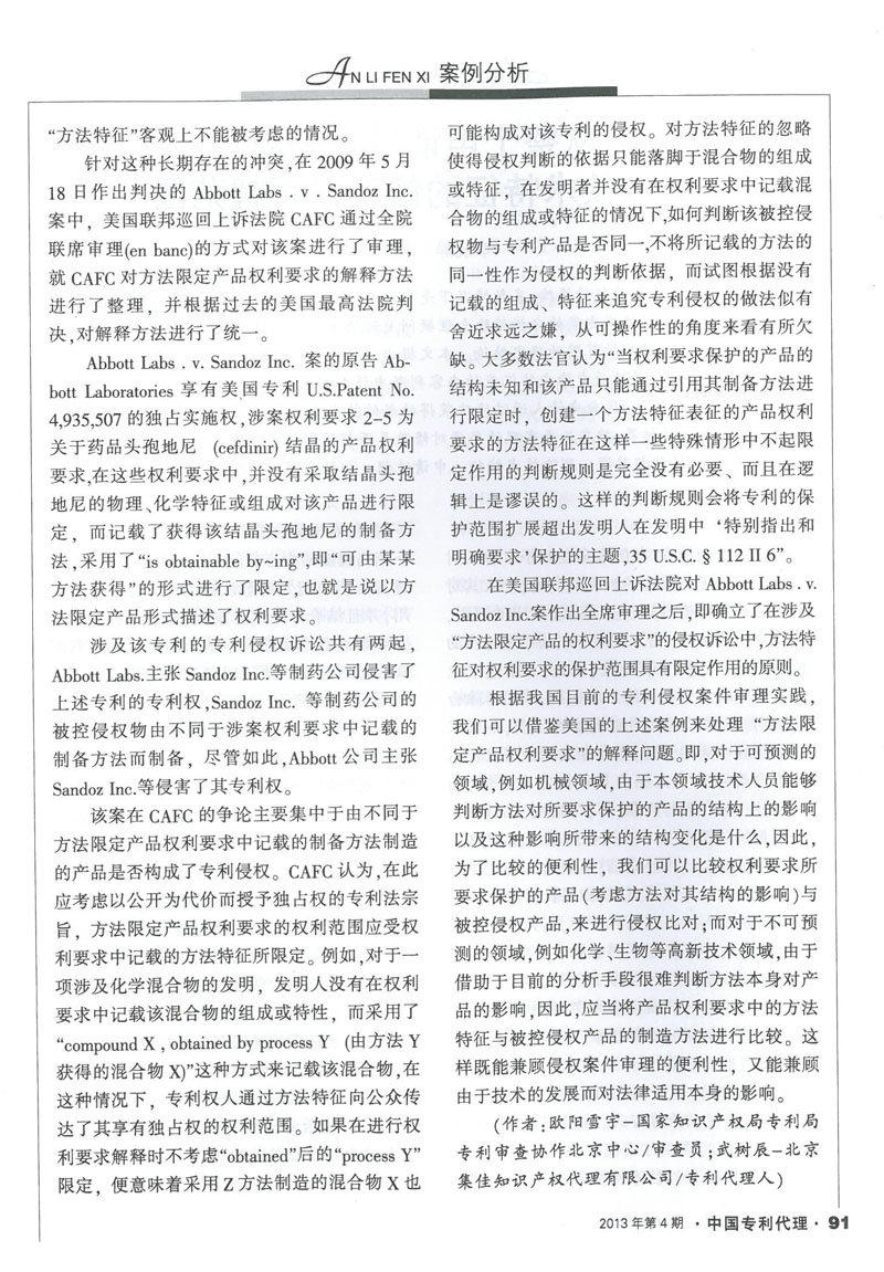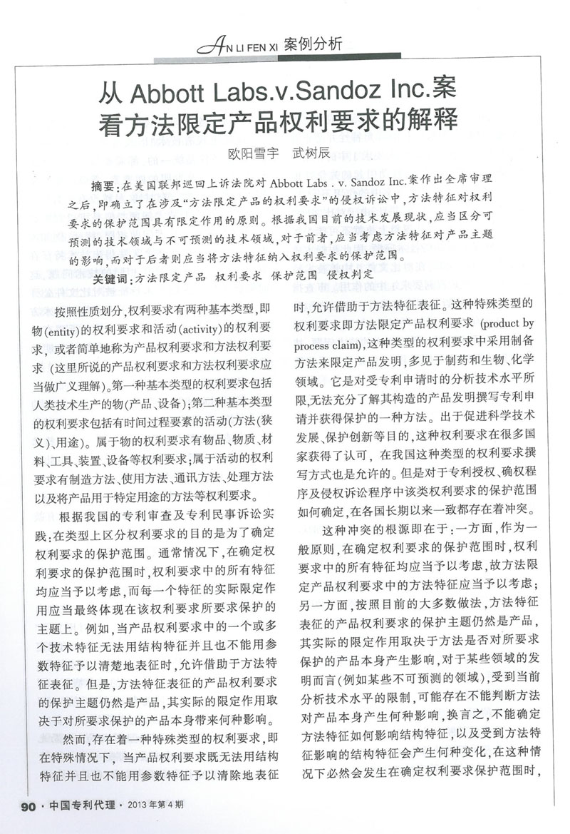 集佳代理人文章《從Abbott Lans.v.SandoZ Inc.案看方法限定產(chǎn)品權(quán)利要求的解釋》在《中國(guó)專利代理》發(fā)表