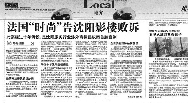 《時(shí)代商報(bào)》:法國“時(shí)尚”告沈陽影樓敗訴