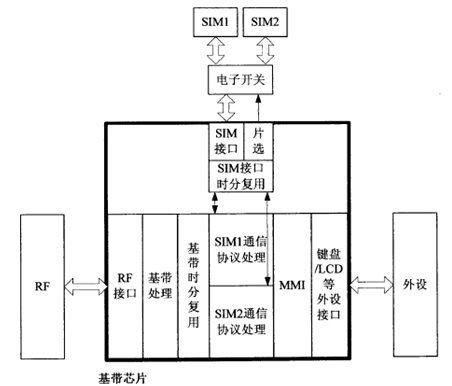 參照上圖,所述單套通信器件實(shí)現(xiàn)的雙卡雙待手機(jī)包括射頻模塊(RF)、基帶芯片、外設(shè)和兩個(gè)SIM卡槽(SIM1、SIM2),所述的基帶芯片具有SIM接口時(shí)分復(fù)用模塊和基帶時(shí)分復(fù)用模塊,以及SIM1通信協(xié)議處理模塊和SIM2通信協(xié)議處理模塊,所述的基帶芯片通過SIM接口跟一個(gè)同時(shí)連接兩個(gè)SIM卡槽的電子開關(guān)相連,并通過片選模塊對(duì)電子開關(guān)進(jìn)行控制。從而在一套手機(jī)硬件上實(shí)現(xiàn)雙卡同時(shí)待機(jī),減少了雙卡手機(jī)的體積,降低了成本,使用便捷。