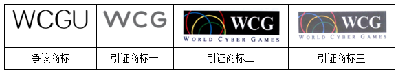 首先,對比系爭商標(biāo)與引證商標(biāo)一,雖然系爭商標(biāo)由四個(gè)字母構(gòu)成,引證商標(biāo)由三個(gè)字母構(gòu)成,但是系爭商標(biāo)前三個(gè)字母與引證商標(biāo)完全相同,屬于《商標(biāo)審查審理指南》5.1.9 對于“個(gè)別字母不同”中的“增加或者減少字母”的解釋范圍。對比系爭商標(biāo)與引證商標(biāo)二、三,雖然系爭商標(biāo)由四個(gè)字母構(gòu)成,引證商標(biāo)除了“WCG”還包含其他文字及圖形,但是,引證商標(biāo)二、三包含的“WCG”獨(dú)立于其他文字及圖形,且為引證商標(biāo)二、三的顯著識別文字。系爭商標(biāo)前三個(gè)字母與引證商標(biāo)顯著識別文字完全相同,屬于《商標(biāo)審查審理指南》5.1.15 規(guī)定的情形。