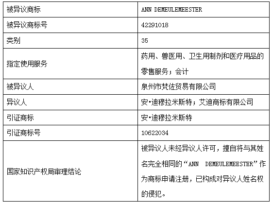 國家知識產權局經審理本案認為:被異議商標“ANN DEMEULEMEESTER”指定使用于第35類“藥用、獸醫用、衛生用制劑和醫療用品的零售服務;會計”等服務上。異議人引證在先注冊的第10622034號“安?迪穆拉米斯特”等系列商標核定使用于第35類“商業場所搬遷;文秘;會計”等服務上。雖然雙方商標指定使用的部分服務相近,屬于類似服務,但雙方商標文字構成及整體外觀具有一定區別,未構成近似商標,因此雙方商標未構成使用于類似服務上的近似商標。本案中,異議人稱被異議人侵犯其姓名權并提供了如下證據:異議人ANN DEMEULEMEESTER為世界知名時尚設計師,曾多次參加米蘭時裝周、巴黎時裝周等時尚頂級活動,同時異議人創辦的同名品牌“ANN DEMEULEMEESTER”在倫敦、巴黎、東京、香港、上海等地均有其專賣店,并在相關公眾中獲得了一定的影響力。上述證據可證明:異議人ANN DEMEULEMEESTER在時尚行業內已具有一定知名度,為相關公眾所知曉。此外,ANN DEMEULEMEESTER獨創性極高,并非常見的外國姓名,且被異議商標“ANN DEMEULEMEESTER”是普通字體的純英文商標,與異議人姓名在字母組成及呼叫上完全相同。被異議人未經異議人許可,擅自將與其姓名完全相同的“ANN DEMEULEMEESTER”作為商標申請注冊,已構成對異議人姓名權的侵犯。