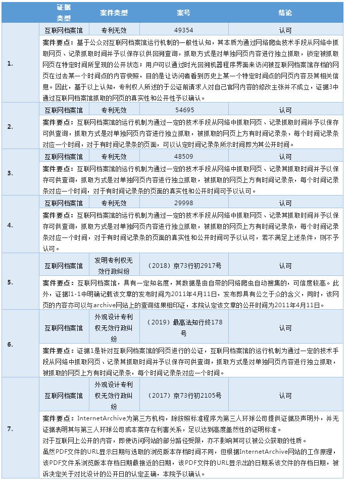 互聯網檔案館(Internet Archive)是一家以普及利用所有知識為目標的非營利性數字圖書館?;ヂ摼W檔案館提供永久存儲和免費的公共訪問的數字化材料信息集合,讓公眾上傳和下載數字材料到其數據集群,但其大部分數據是靠其網絡爬蟲自動收集。互聯網檔案館的Web歸檔文件系統Wayback機器包含了超過1500億以上的網頁存檔。有別于其他類型的網絡證據,互聯網檔案館較為特殊,其本質上屬于可溯源的歷史上曾存在的網頁資源記錄,在抓取網頁信息時即可證明該網頁相關信息處于公開狀態,并且互聯網檔案館會記錄抓取信息的時間。下表是認定互聯網檔案館網絡證據的案例梳理。