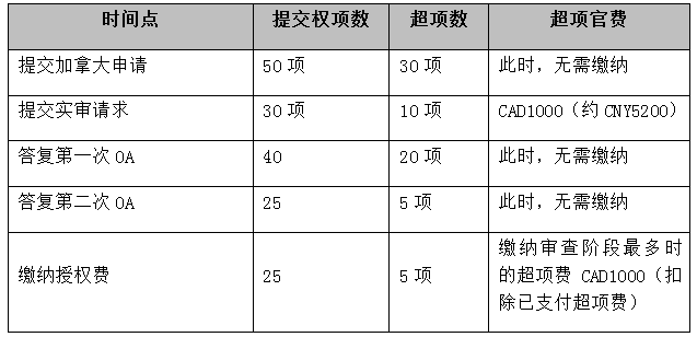 自2022年10月3日之后,申請人在提出實審請求時應支付超項官費,超出20項權項每項收取附加費CAD100。