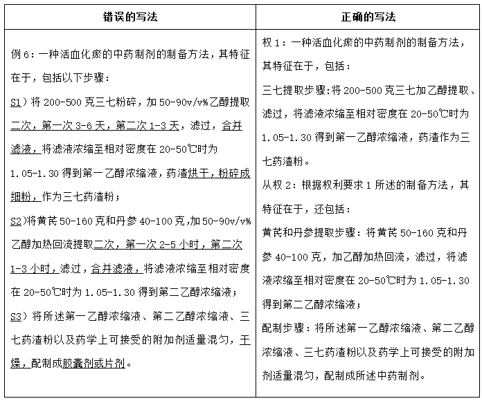 此外,撰寫人應(yīng)知悉,獨(dú)權(quán)的技術(shù)特征數(shù)量越多,保護(hù)對(duì)象的范圍越小。例如,“一種桌子,其特征在于,具有4條腿。”,該權(quán)利要求告訴公眾4條腿的是本發(fā)明的桌子,1~3條腿或5條腿以上的都不是本發(fā)明的桌子;如果寫成“一種桌子,其特征在于,具有4條腿且具有圓形桌面。”,則進(jìn)一步限定了4條腿且圓形桌面的才是本發(fā)明的桌子,將桌面是方形等非圓形形狀的排除到了本發(fā)明的范圍之外。所以,要精剪獨(dú)權(quán)的技術(shù)特征以構(gòu)建更寬的保護(hù)范圍,細(xì)節(jié)特征可寫入從權(quán)以構(gòu)建中范圍至窄范圍的退守性權(quán)利要求。例如,對(duì)發(fā)明點(diǎn)是將三七藥渣粉作為藥物活性組分的例6的發(fā)明而言,可爭取的最大保護(hù)范圍是僅將步驟1寫入獨(dú)權(quán)1,其他步驟寫入從權(quán)。