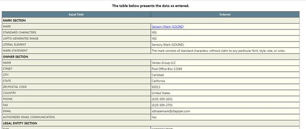 聲音商標在官網的頁面上顯示為SENSORY MARK (SOUND),其在申請文件頁面的Mark部分為一段音軌,具體如下:
