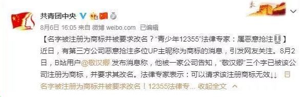 2019年8月3日,一條題為《我被告知跟我22年的名字我不能用要我改名!我如何維權(quán)的!》的網(wǎng)絡(luò)視頻在B站上引發(fā)網(wǎng)友關(guān)注,視頻發(fā)布人是UP主“敬漢卿”。在視頻中“敬漢卿”吐槽,自己用了22年的名字被他人惡意搶注,對(duì)方還給自己發(fā)了相關(guān)證明材料,要求其支付“敬漢卿”的商標(biāo)購買費(fèi)用或停止使用“敬漢卿”的名字。截至2019年8月6日10時(shí),相關(guān)視頻瀏覽量已突破1400萬,近20萬網(wǎng)友參與線上討論。敬漢卿表示,他已經(jīng)向有關(guān)部門遞交了商標(biāo)無效申請(qǐng),并正在搜集材料控告被異議人惡意搶注。