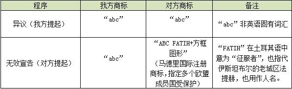 (一)爭(zhēng)議焦點(diǎn)一:我方“abc”商標(biāo)是否與對(duì)方“ABC FATIH+方框圖形”商標(biāo)構(gòu)成相同、類似商品上的近似商標(biāo),易造成消費(fèi)者的混淆誤認(rèn)。適用的法條是歐盟商標(biāo)法第60條第(1)款(a)項(xiàng)。