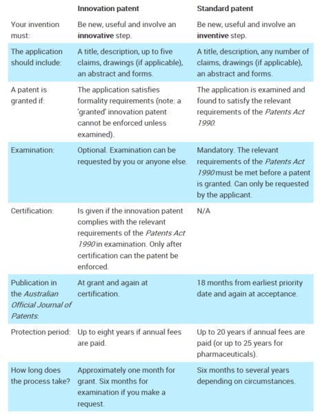 澳大利亞專利分為:標(biāo)準(zhǔn)專利Standard patent(類似中國的發(fā)明)、創(chuàng)新專利innovation patent(類似中國的實(shí)用新型,但也有較多不同之處)、外觀專利。