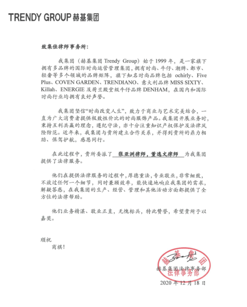 近日,集佳收到來自赫基集團的表揚信,信中,客戶對集佳張亞洲律師、董逸文律師的辛勤付出表示感謝,為他們細致高效的專業服務、敬業正直的工作態度點贊!