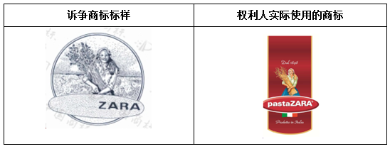 由以上對比可以看出,權(quán)利人實際使用的商標,圖形背景部分與注冊商標形狀略有不同,文字部分也多了英文“pasta”,但“pasta”中文含義為“意大利面食”,實際上為訴爭商標核定使用商品的通用名稱,因此自身缺乏顯著性,權(quán)利人實際使用的商標顯著性識別要素仍為“ZARA及圖形”。