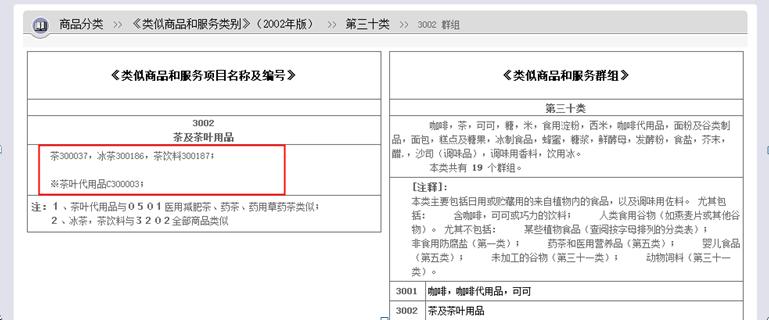 ”商標于1992年10月20日申請注冊,申請注冊之初,指定的商品為“茶;綠茶;烏龍茶;紅茶;花茶”等。雖復審商標指定使用在此類茶產品上,但通過申請人提供的證據材料可知,“道地”品牌系申請人名下歷史悠久且非常重要的“茶飲料”品牌之一。根據現行《類似商品和服務區分表》,申請人所涵蓋的“道地”產品線業務應屬于第30類3002類似群第(二)部分的“茶飲料”,非3002類似群第(一)部分的“茶;綠茶;烏龍茶;紅茶;花茶”,且3002類似群第(一)部分和第(二)部分商品不類似。但對于當時1992年申請注冊復審商標時,分類表中僅有一項“茶”商品,而“茶飲料”也是在2002年版《類似商品和服務區分表》中添加的,3002群組的商品僅有4項,即“茶;冰茶;茶飲料;茶葉代用品”,商品互為類似商品。