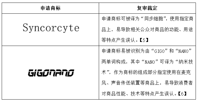 如“Syncorcyte”,其中“sync”為英文“synchronization(意為同時(shí),同步)”的常用縮寫(xiě),“cyte”可以翻譯為“細(xì)胞”,因此該商標(biāo)可以模糊的解釋為“同步細(xì)胞”,雖然“sync”和“cyte”都不是簡(jiǎn)易英文單詞,一般消費(fèi)者難以識(shí)別,但使用在第5類(lèi)醫(yī)藥類(lèi)商品上,審查員從嚴(yán)把握,經(jīng)復(fù)審審理最終判定存在產(chǎn)生誤認(rèn)的可能。