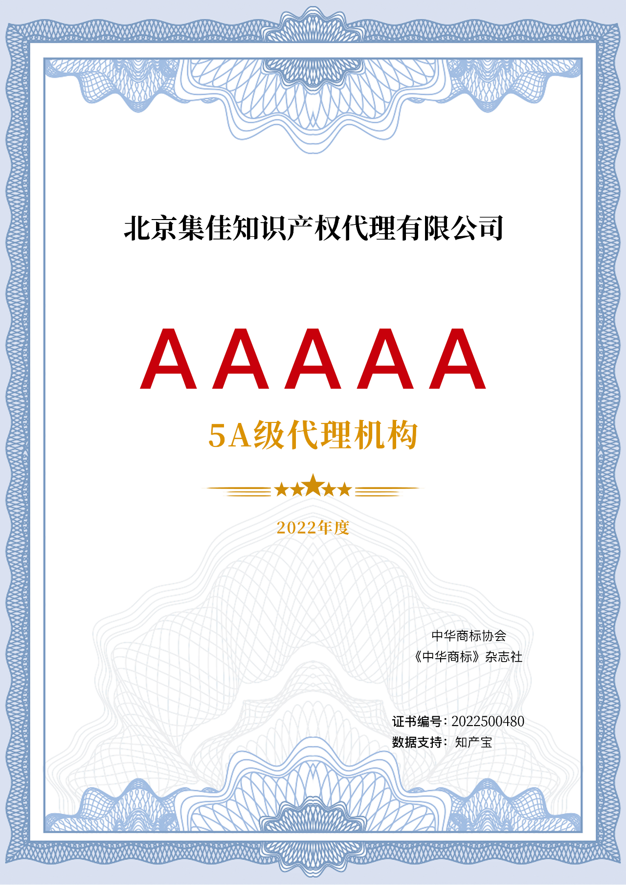 2023年11月22日,由中華商標協會指導、《中華商標》雜志社聯合知產寶共同發布的《中國商標代理600強》榜單正式揭曉,集佳憑借穩健的綜合實力、優質的專業服務和良好的業界聲譽榮登“5A級代理機構(TOP 100)”榜單!