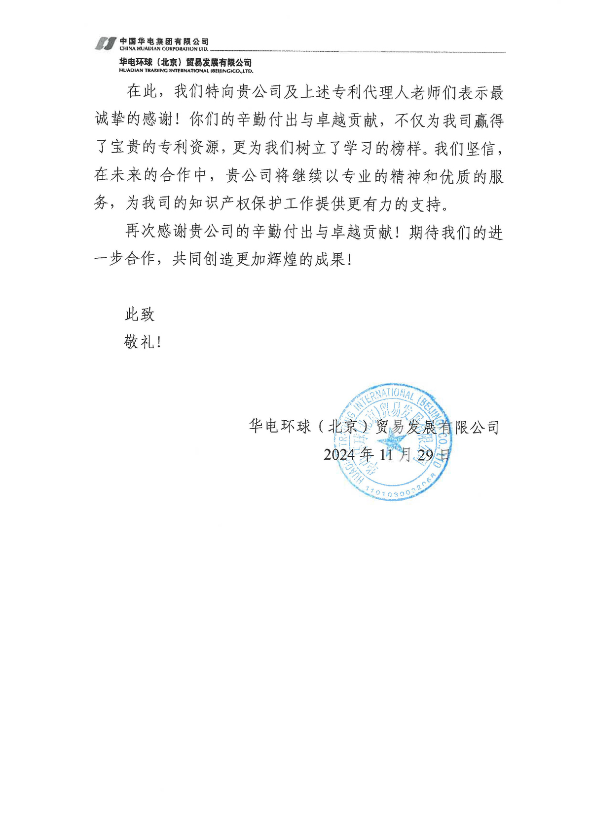 近日,集佳收到客戶華電環球(北京)貿易發展有限公司的感謝信,對集佳在知識產權申報與保護工作中給予的專業指導與大力支持表示由衷感謝,同時對集佳孫越馬小青王偉力李上王榮鑫等專業人員在專利代理工作中所展現出的專業精神與卓越成就表示高度贊揚!